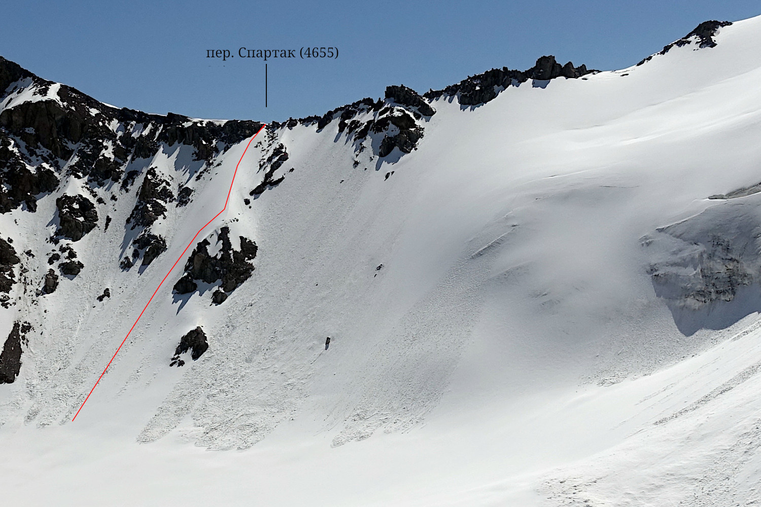 Ф.3. Выход на гребень в. 4645 был чисто ледовым и соответствовал 2А к.т. Группа не имела права совершать первопрохождения таких участков. |