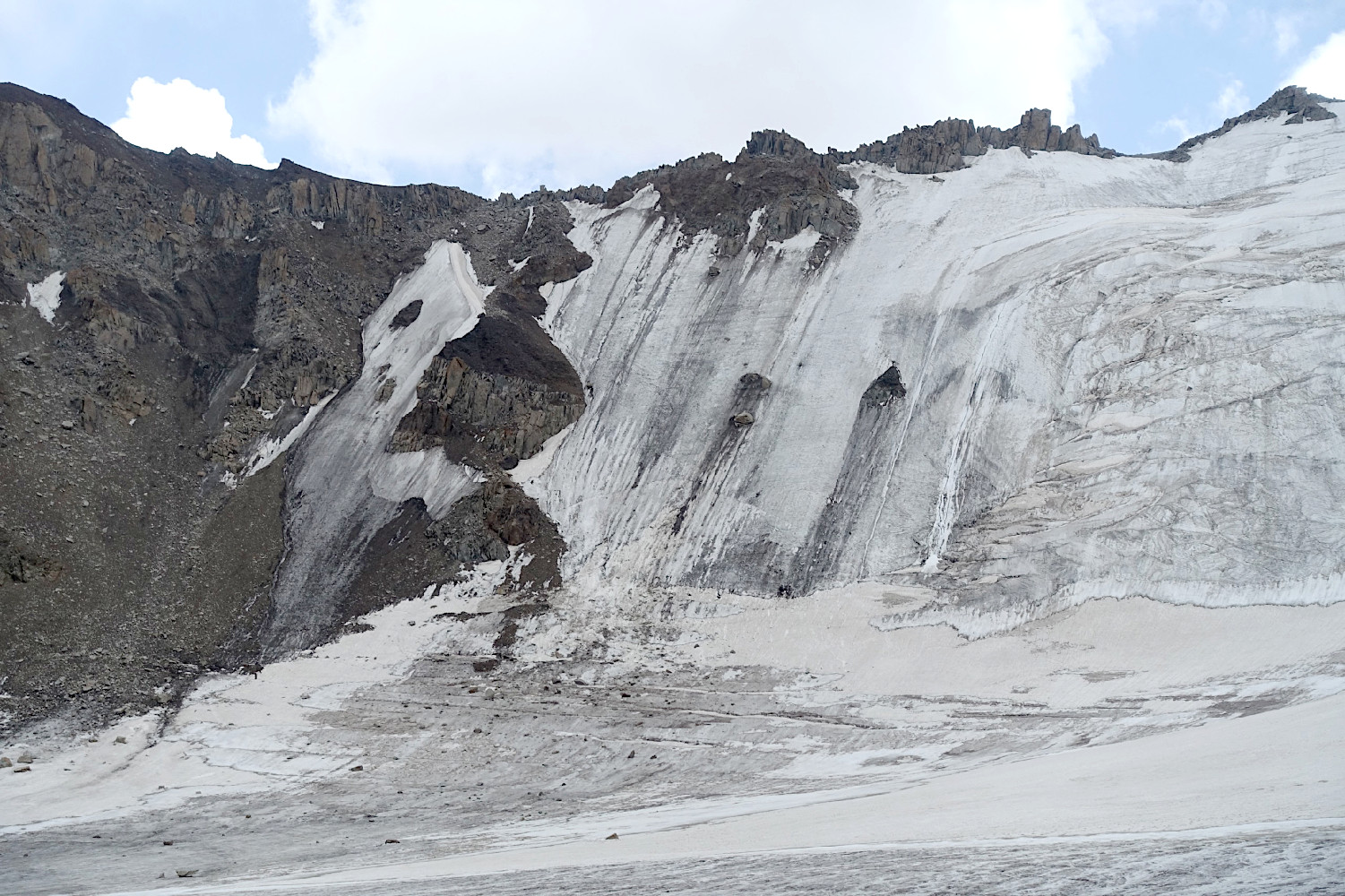 1.8. Особенности снежно-ледовой обстановки на юге Киргизии летом 2025 г. Лето 2025 года на юге Киргизии было абсолютно аномальным. Оно было очень жарким и засушливым. Снега на высотах ниже 4600 практически не было, все горы были закованы льдом. Камнеопасность была чудовищной. Бесчисленные камни, которые годами лежали под снегом или были скованы снегом, неожиданно освободились и скатывались по голому льду, разгоняясь до неимоверных скоростей. Из-за камнеопасности мы отказались от прохождения перевала Спартак (4655, 2А). Ниже приводятся фотографии пер. Спартак в обычный сезон и в июле 2025 года. . |
