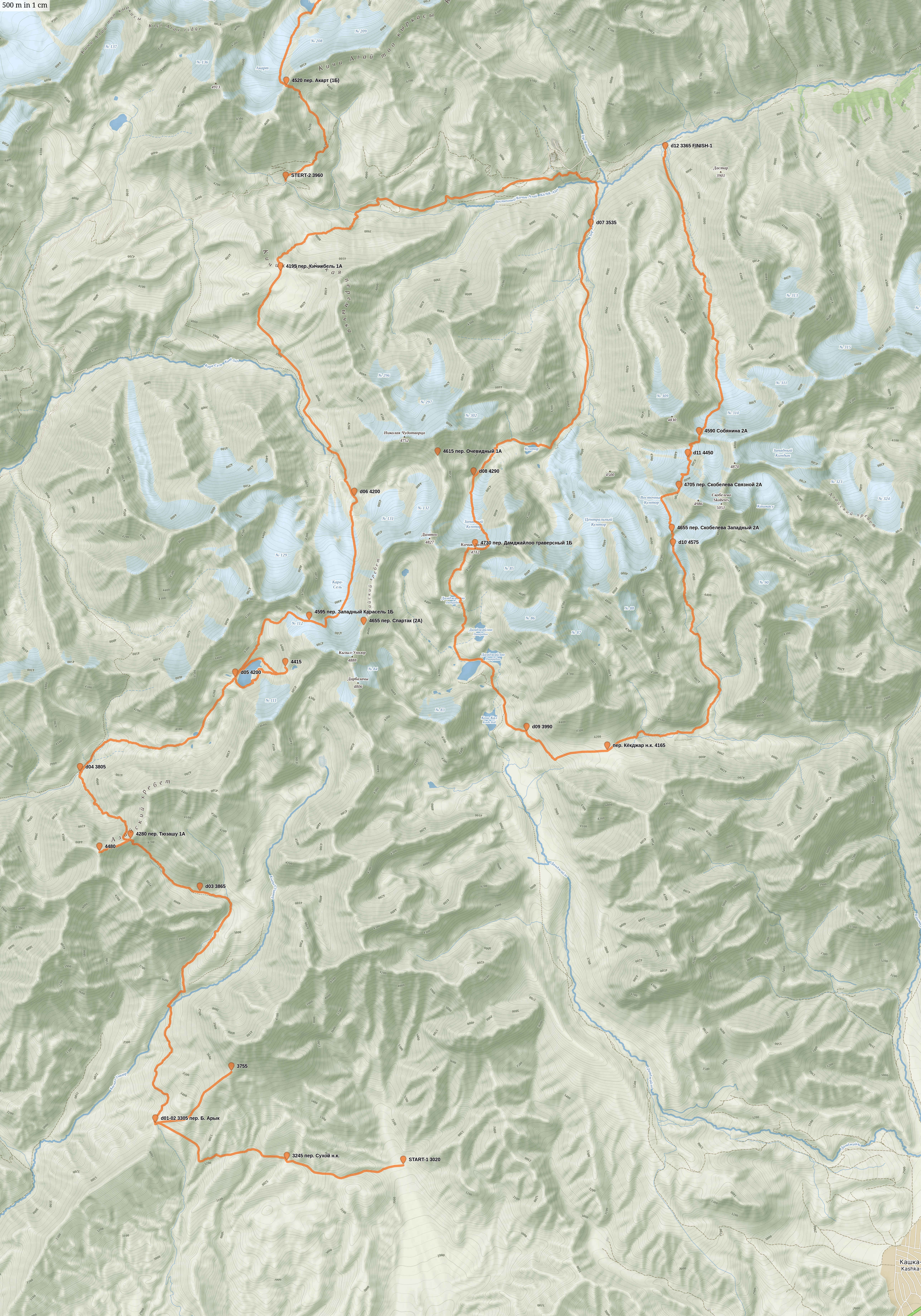 . Наконец, повысилась сложность перевала Зап. Карасель (4595,1Б), на спуске по его восточному склону нам пришлось провесить по льду веревку перил, тогда как в обычные годы перевал проходится пешком в связках одновременно. 1.10. Безопасность. Группа имела спутниковый телефон и осуществляла сеансы связи с московским куратором не реже одного раза за пару дней. Московский куратор систематически прогнозировал погоду и передавал эти прогнозы в группу. Наша команда была поставлена на учет в МЧС Киргизии. У каждого участника имелась страховка с возможностью вертолетной эвакуации и с поисково-спасательными работами. В группе имелось два GPS-приемника с загруженными треками основного и запасных вариантов маршрута. 1.11. Элементы новизны в маршруте. Отметим два новых элемента. К первому можно отнести радиальное восхождение с перевала Тюзашу на вершину 4480, на которой мы обнаружили пустой тур. Тем не менее, о восхождениях на эту вершину в туристских отчетах информации не найдено. Вторым элементом был радиальный выход с озера 4200 в долине р. Тюзашу к самому верхнему озеру 4400. Насколько нам известно, на берегу этого озера туристов еще не было. В итоге нами были осмотрены и сфотографированы в окрестностях этого озера три новых потенциальных перевала. 1.12. Соответствие заявленного и пройденного маршрута. Первоначально планировалась следующая нитка основного маршрута: г. Ош - Алайская долина - р. Кюнгей-Отек - пер. Сухой (3245, н.к.) - пер. Большой Арык (3305, н.к.) - р. Кызыл-Ункюр - пер. Тюзашу (4280, 1А) - р. Тюзашу - рад. в. 4645 (1Б, п.в.) - пер. Зап. Карасель (4595, 1Б) - лед. Карасель - пер. Спартак (4655, 2А) - р. Дамджайлоо - пер. Кёкджар (4185, н.к.) - р. Кёкджар - пер. Скобелева Зап. (4655, 2А) - пер. Скобелева Связной (4700, 1Б) - пер. Дмитрия Собянина (4590, 2А) - р. Вост. Кичик-Алай - пер. Кичикбель + траверс (1А) вост. склона в. 4325 - пер. Акарт (4520, 1Б) - р. Акарт - р. Чиле - г. Янгинаукат. При этом вместо заброски планировалась «завозка», а именно, после спуска с перевала Дмитрия Собянина к дороге вдоль р. Вост. Кичик-Алай нам должны были привезти продукты питания и топлива для прохождения финальной части похода, и на этой же машине планировалось, что Лебедев А.А. уедет в Ош, см. пункт 1.6. При этом на старте группа брала с собой ресурс на 12 дней, что должно было хватить до места «завозки» с запасом в 3 дня. Однако два фактора помешали осуществиться этому плану в полной мере. Первый фактор — высокая камнеопасность в аномально жаркое и засушливое лето 2025 г., из-за которой мы были вынуждены отказаться от прохождения пер. Спартак, см. пункт 1.8. Второй фактор — слабая подготовка к походу участника Макалкина В.А. У него не включался должным образом механизм долговременной высотной адаптации. Замечено, что такое бывает, если участник перед походом по каким-либо причинам испытывал длительный стресс [2]. По словам Макалкина В.А., продолжительный стресс у него действительно был. Опыт участия в горной "двойке" в районе Высокого Алая с перевалами до 4600 м в данной ситуации ему не помог. События развивались следующим образом. Утром на второй день похода у Макалкина В.А. ЧСС в покое значительно превышало 105 ударов в минуту, и мы решили никуда не идти и сделать днёвку, высота там 3305 м. Так мы потеряли первый запасной день. Далее мы шли по плану, но отказались от первовосхождения на в. 4645, так как маршрут на неё при изобилии льда усложнился до 2А к.т., с