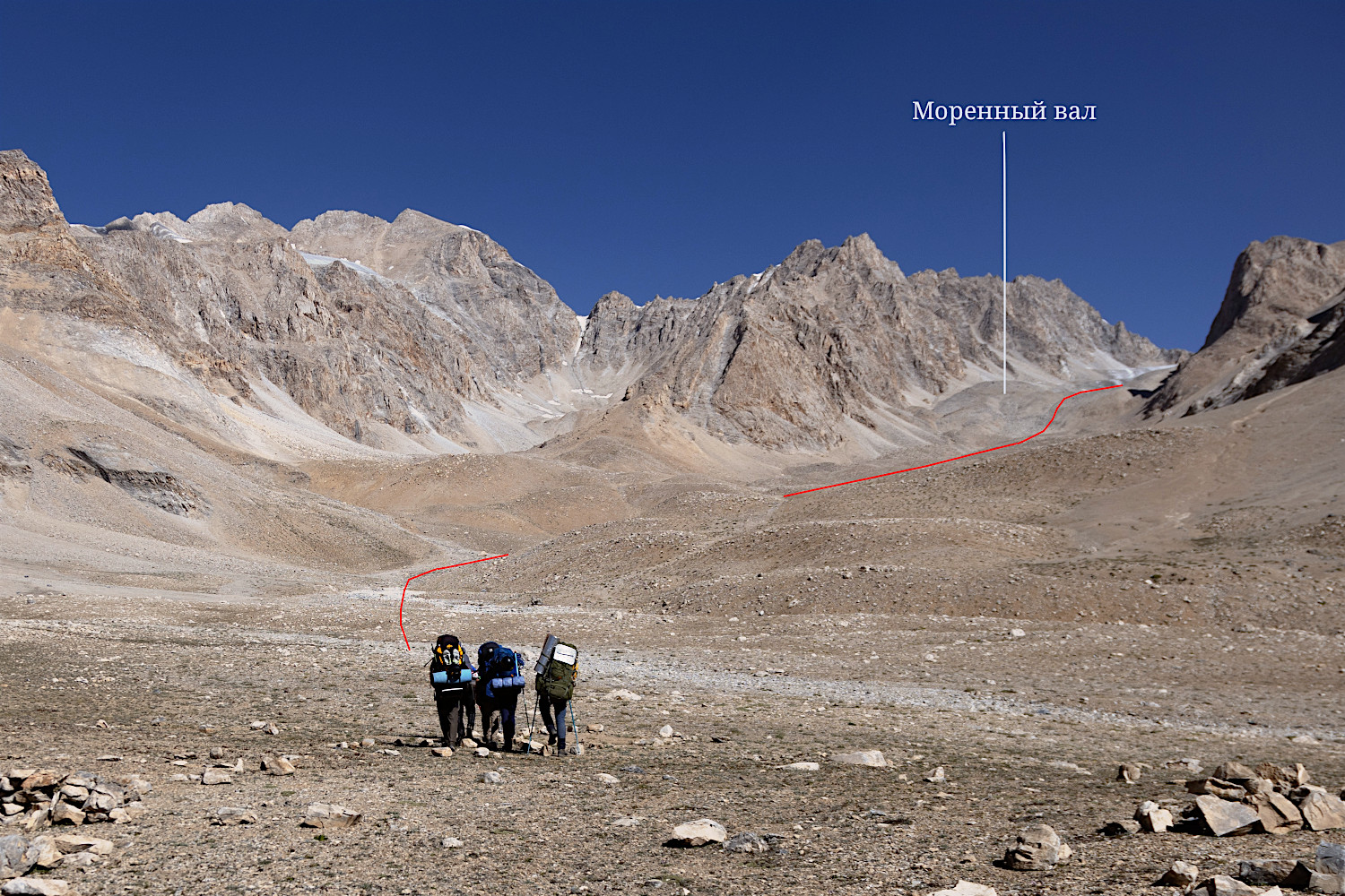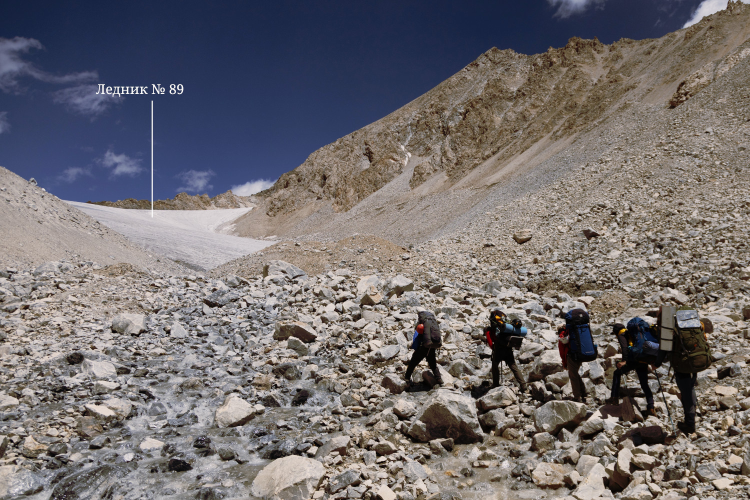 2.9. Перевал Скобелева Западный (4655, 2А) расположен в Алайском хребте западнее пика Скобелева (5051). Перевал ориентирован с юга на север и соединяет ледник № 89 в истоках р. Кёкджар (на юге) с ледником № 307 в системе ледника Кумтор (на севере). Номера ледников соответствуют каталогам [7 и 3]. Координаты перевала: 39° 47.240'N 72° 36.230'E 4655 H. Утром 30.07.2025 мы собрали лагерь и траверсом западного склона пер. Кёкджар (4165, н.к.) взошли на обширное плато этого перевала. Путь с перевала до р. Кёкджар, берущей начало с ледника № 89, прост, очевиден и в описании не нуждается. Достигнув р.Кёкджар, мы повернули налево (на север) и начали подъем по террасе правого берега. Путь по террасе привел к осыпному прижиму, после траверса которого мы вошли в широкую долину, см. фото 41. Далее шли вдоль реки, в основном, по её левому берегу. В точке 39° 46.045'N 72° 36.630'E 4155 H мы свернули налево и поднялись в сухое русло ручья. Вода с ледника № 89 здесь просачивается под землей, а речка заполняется водой из боковой более восточной долины. Путь к леднику № 89 преграждает моренный вал, за которым находится озеро 4375, на берегу которого можно поставить лагерь. На моренный вал мы поднялись по центру, там имеется нечто, напоминающее тропу. |