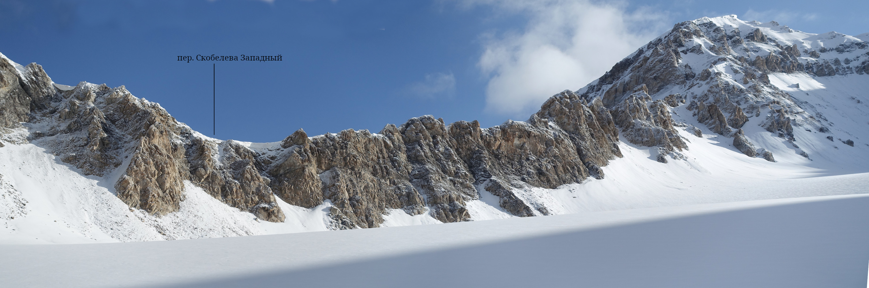 С севера к перевалу Скобелева Западный поднимается пологий ледник. В июле 2025 года он был открыт, см. фото 50. |