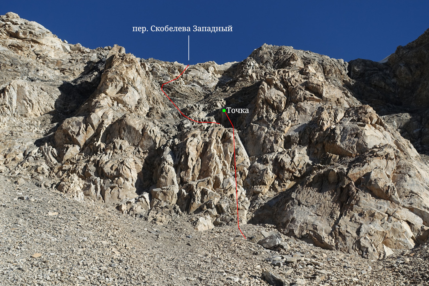 Утром 31.07.2025 мы собрали лагерь и подошли к подножию перевала Скобелева Западный, см. фото 44 и 45. Путь на перевал идет по скалам. В нижней части пол-веревки скал средней трудности, а выше, от точки до перевала, еще одна веревка по более простым скалам, см. фото 45. |