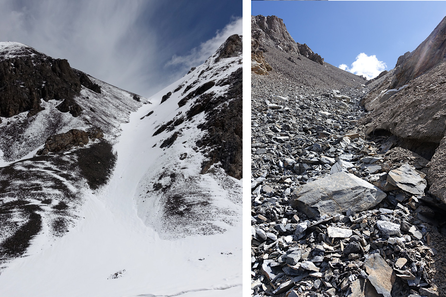 Ф. 51. Вид на пер. Скобелева Связной с ледника № 307 [3]. Оба снимка сделаны в июле: слева в 2021 г. [1], а справа в 2025 г. Седловина перевала широкая и покрыта мелкой осыпью. Здесь, при желании, можно встать лагерем на ночлег. |