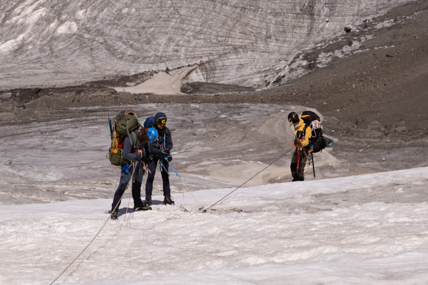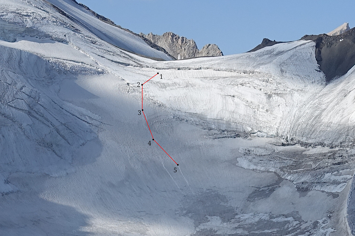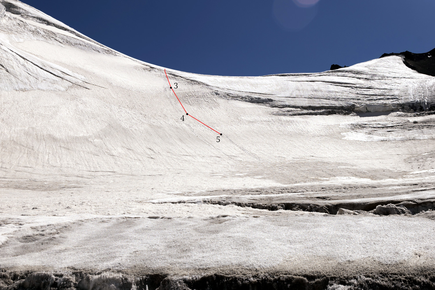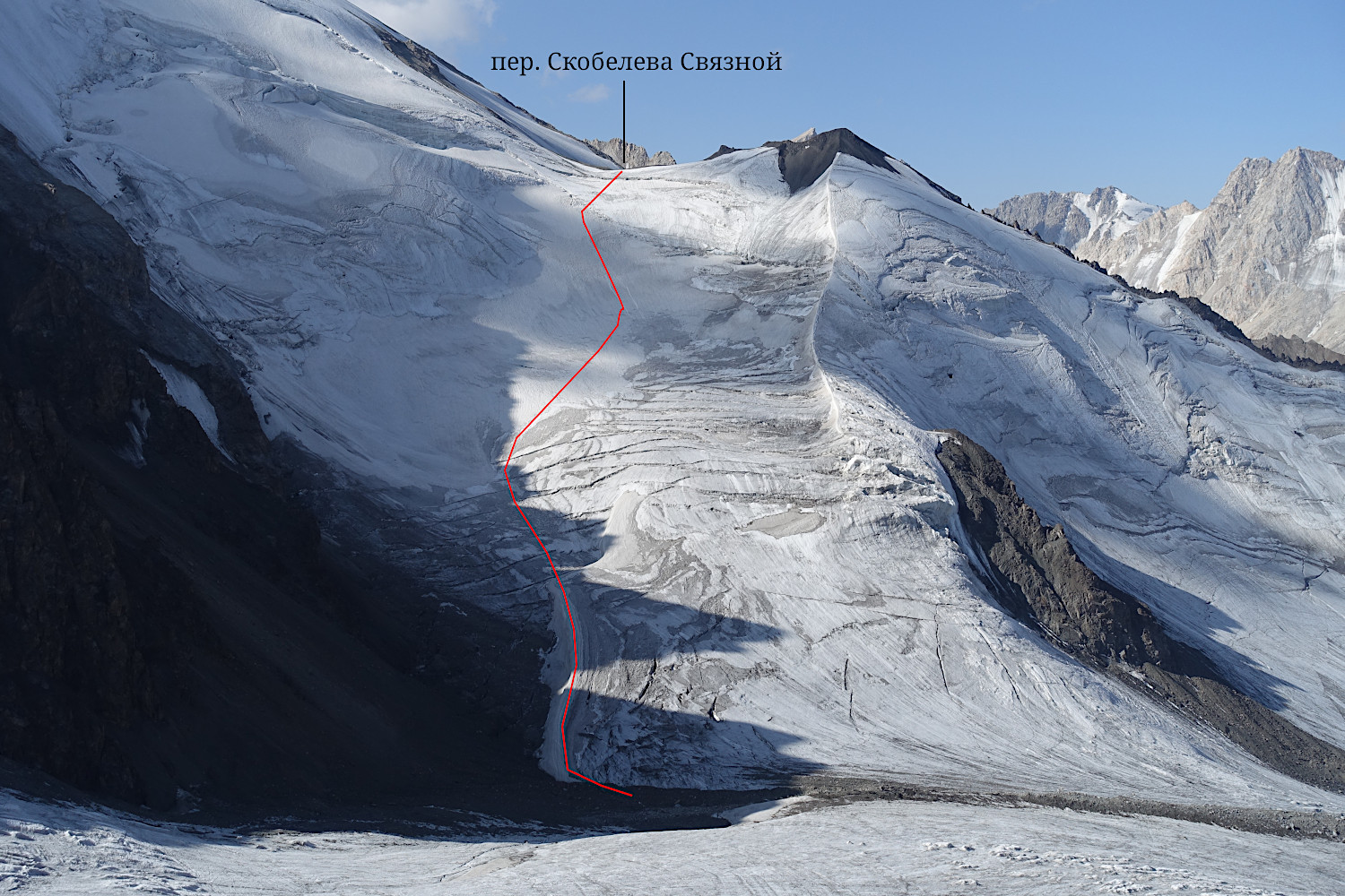 2.10. Перевал Скобелева Связной (4705, 2А) расположен в северо-западном отроге западной вершины пика Скобелева, ориентирован с юго-запада на северо-восток и соединяет верховья ледника № 307 (на юго-западе) с центральной частью ледника № 308 (на северо-востоке). Номера ледников соответствуют каталогу [3]. Перевал Скобелева Связной позволяет обойти ледопад в нижней части ледника № 307 на пути от перевала Скобелева Западный к перевалам Рототаева, Собянина и Скобелева. Координаты седловины: 39° 47.750'N 72° 36.335'E 4705 H. Отсутствие снега на высотах менее 4600 м привело не только к повышению камнеопасности, но и к изменению сложности перевалов. Там, где в обычный сезон удавалось относительно безопасно пройти по ступеням в снегу, теперь приходилось идти с ледобурной страховкой или даже вешать перила. Количество снежных мостов через трещины значительно уменьшилось, а те мосты, которые остались, потеряли надежность. В результате, при спуске с пер. Скобелева Связной мы провесили 4 веревки перил. А в 2021 г., когда команда Лебедева А.А. осуществила первопрохождение этого перевала [1], перил вообще не вешали и оценили перевал, как 1Б. В июле 2025 года перевал Скобелева Связной оказался сложнее перевала Дмитрия Собянина (4590, 2А), он был и протяженнее и разнообразнее, так как требовал не только техники спуска по ледовым склонам, но и опыта преодоления ненадёжных снежных мостов через широкие разломы в леднике. В момент нашего прохождения перевал Скобелева Связной был полноценной "Двойкой А". К перевалу с ледника № 307 [3] ведёт осыпной кулуар. В июле 2021 г. он был заснежен [1], а в июле 2025 г. снега не было. см. фото 51. |