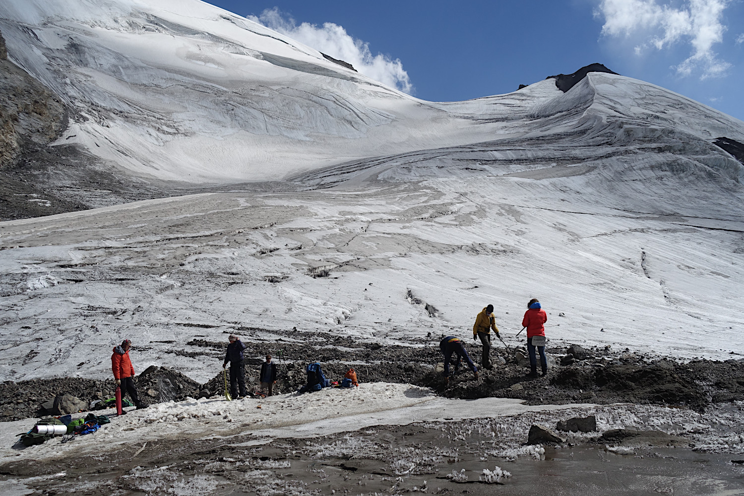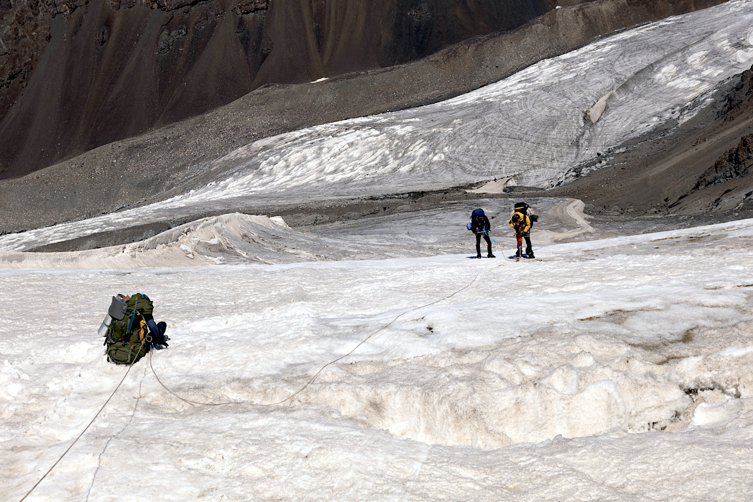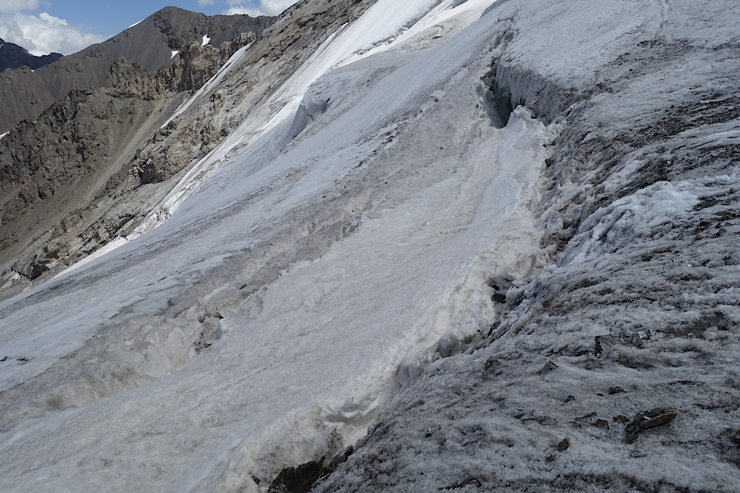 Первым серьезным препятствием на спуске с перевала был огромный разлом, на фото 53 он выше точки 1. Сверху он был покрыт снежным мостом, см. фото 54. Верхний край этого моста протаял, и около льда на краю разлома зияли черные дыры. По сути, это был уже не мост, а карниз. Было совершенно не понятно, насколько широка эта трещина. Лидеру было страшно! Первым делом он со всей дури бросил на мост свой рюкзак. Мост выдержал. После этого он прыгнул к рюкзаку и тут же совершил кувырок через рюкзак, чтобы распределить по пространству тормозящие усилия и остановиться как можно дальше от переднего края трещины, см. фото 55. |