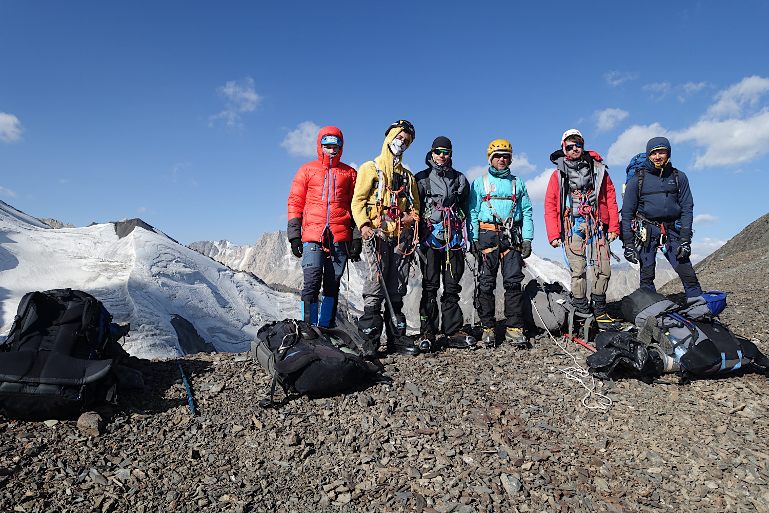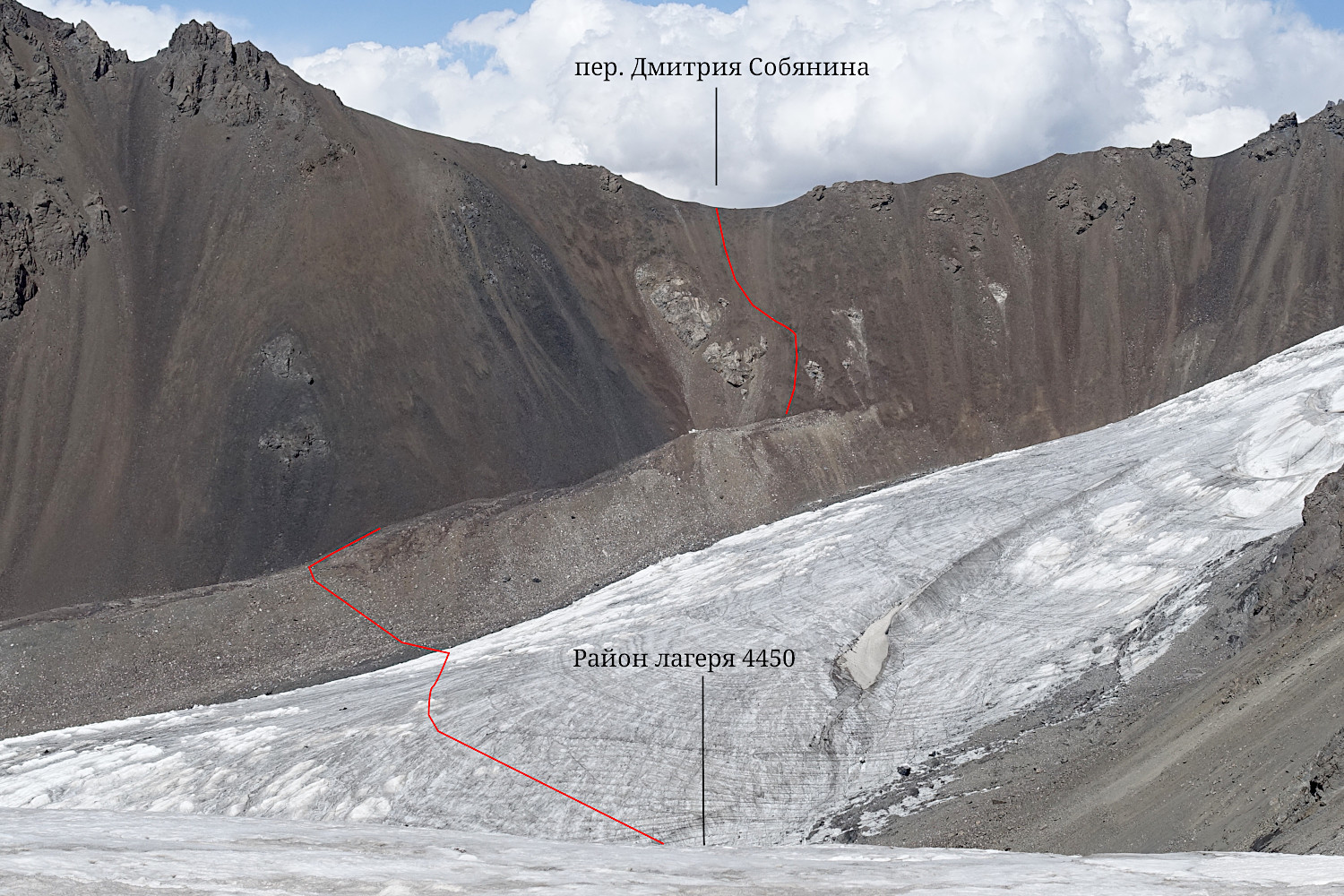 2.11. Перевал Дмитрия Собянина (4590, 2А) расположен в северном и отходящем от пика Скобелева (5051) отроге Алайского хребта. Перевал ориентирован с юга на север и соединяет ледники № 308 (восточная ветвь ледника Кумтор) на юге и № 310 на севере. Координаты седловины: 39° 48.390'N 72° 36.650'E 4590 H. Номера ледников соответствуют каталогу [3]. Утром 01.08.2025 мы собрали лагерь, пересекли восточную ветвь ледника Кумтор и по мелкой осыпи поднялись на перевал Дмитрия Собянина, см. фото 61. |
