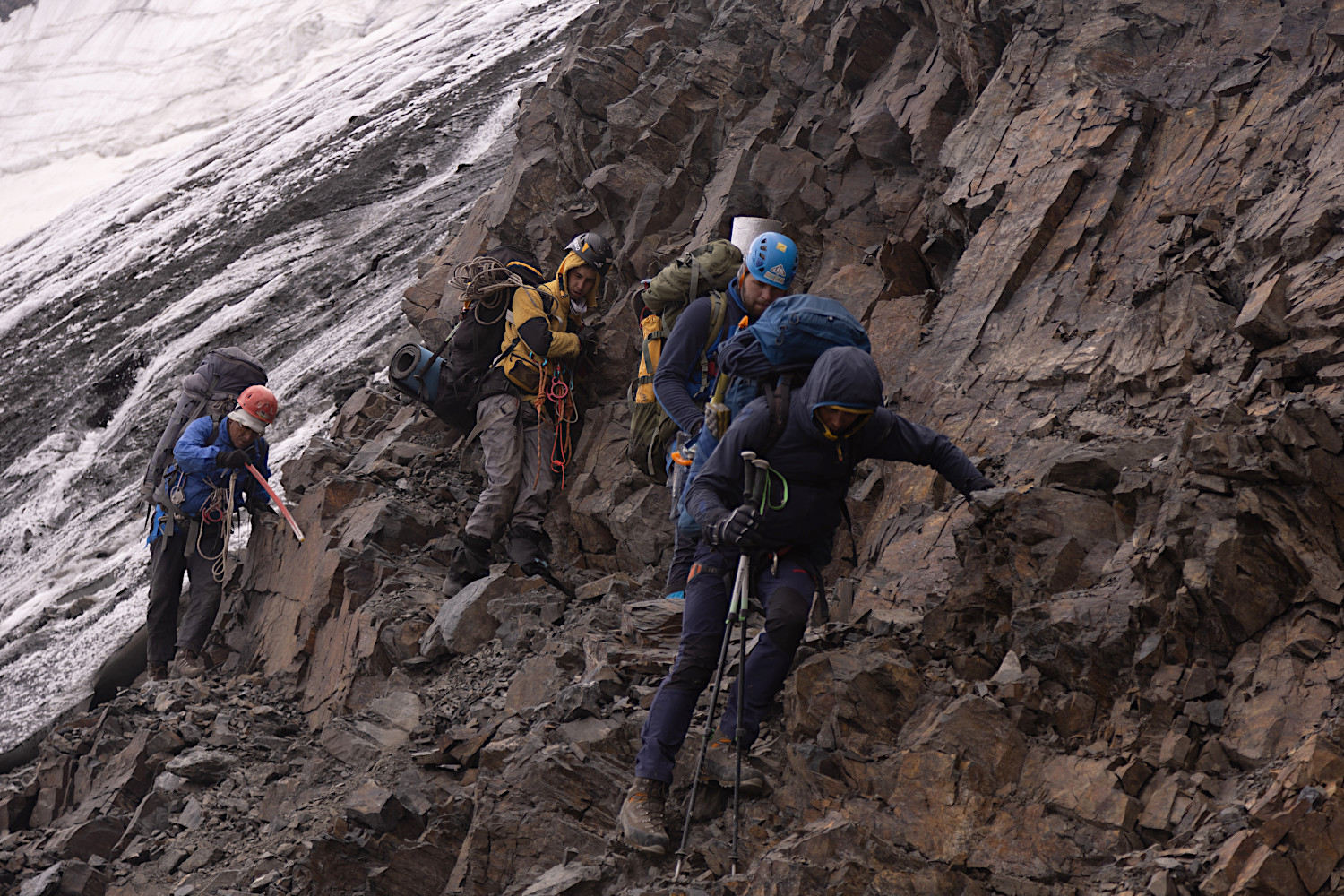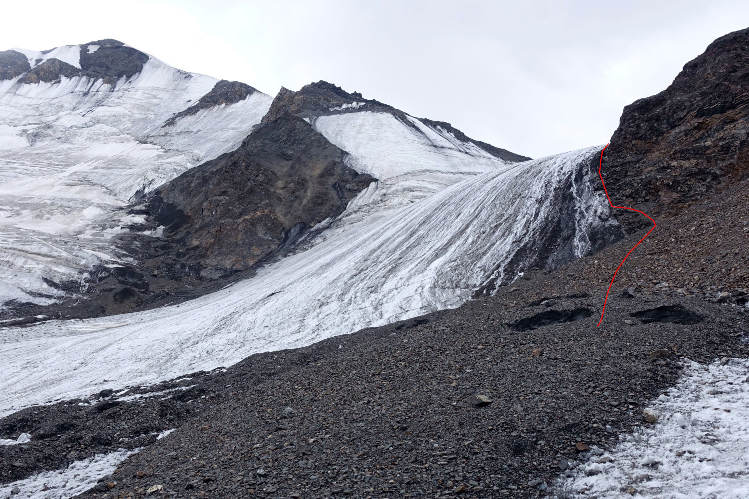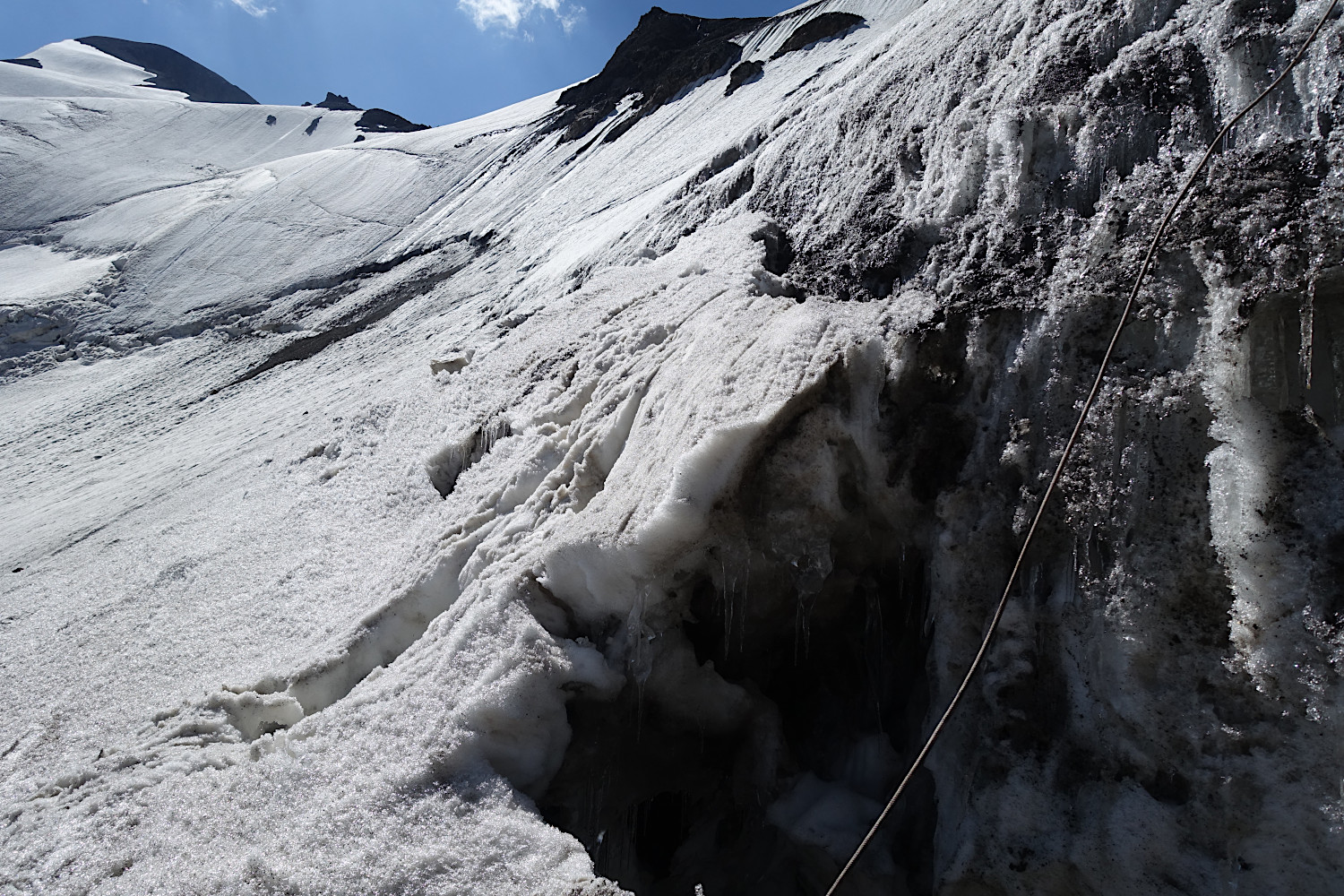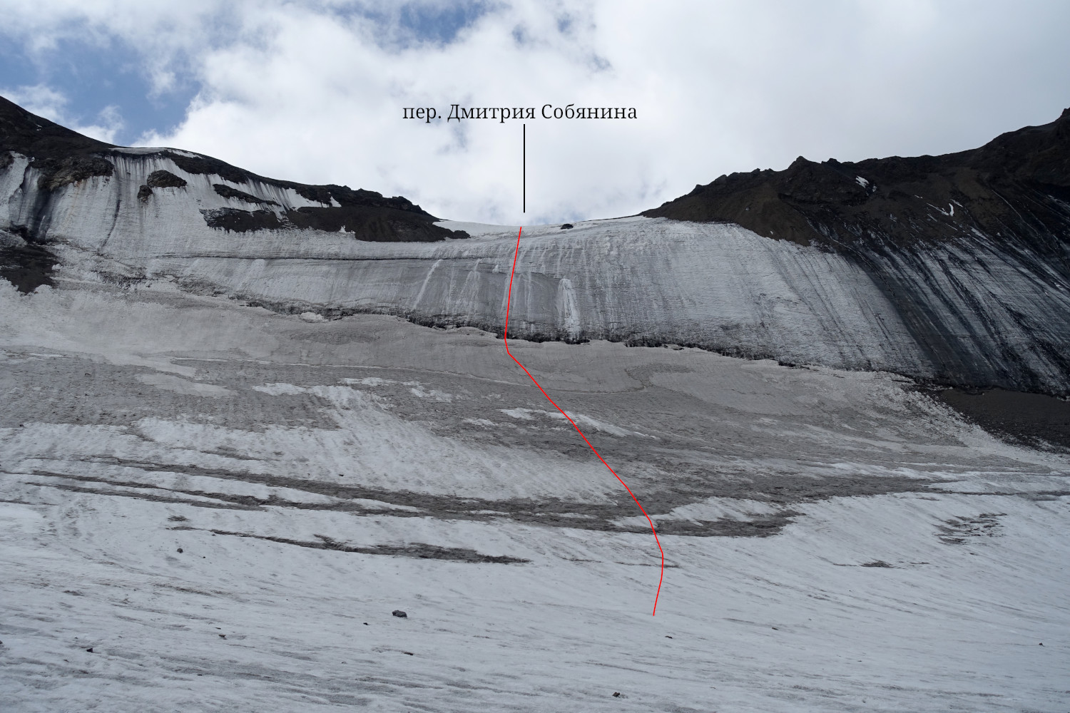 Ф.64. Короткий, но крутой северный склон перевала подрезан мощным бергшрундом. |
