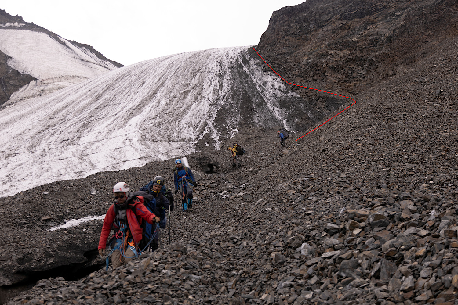 Ниже бергшрунда начинается пологий ледник без трещин. Однако через 700 метров он круто ниспадает, сливаясь с центральной ветвью ледника № 310 [3], см. фото 67. Здесь можно было бы начать вешать перила, но мы предпочли спуститься по рантклюфту левого борта, см. фото 67, 68 и 69. |