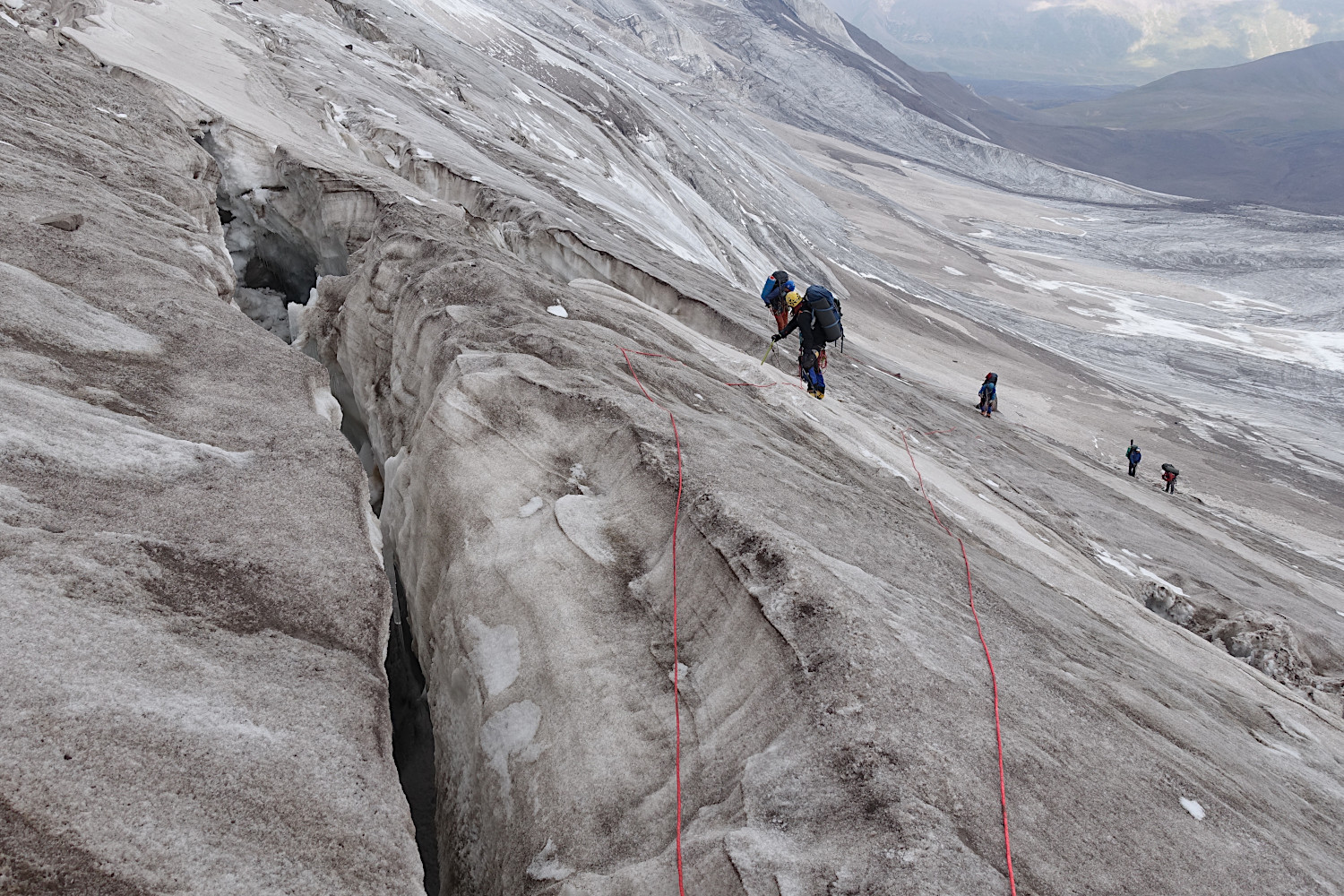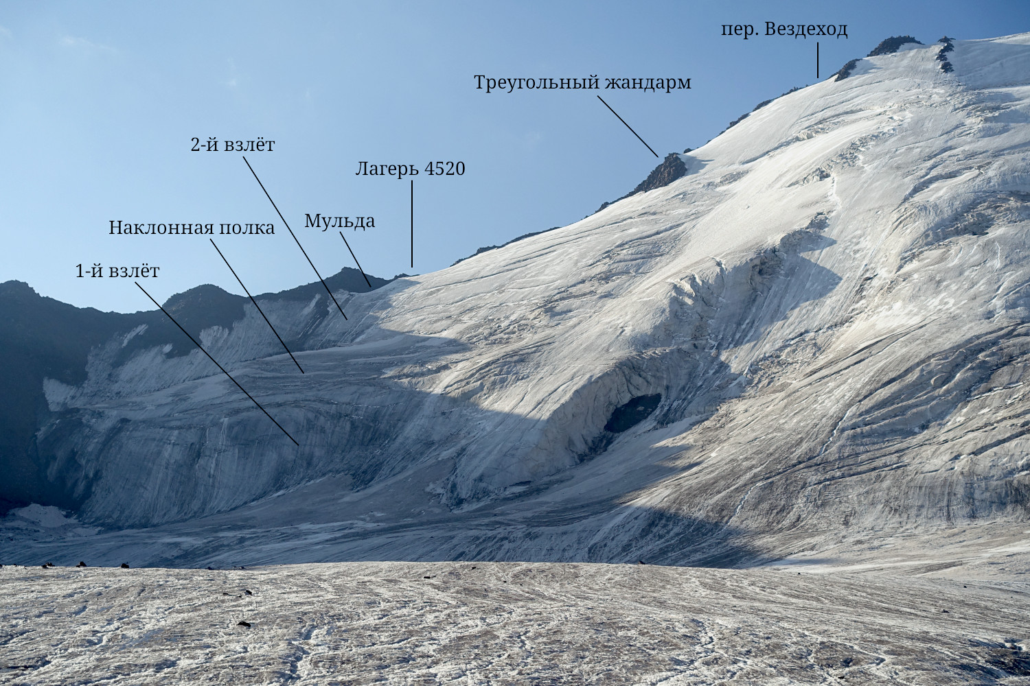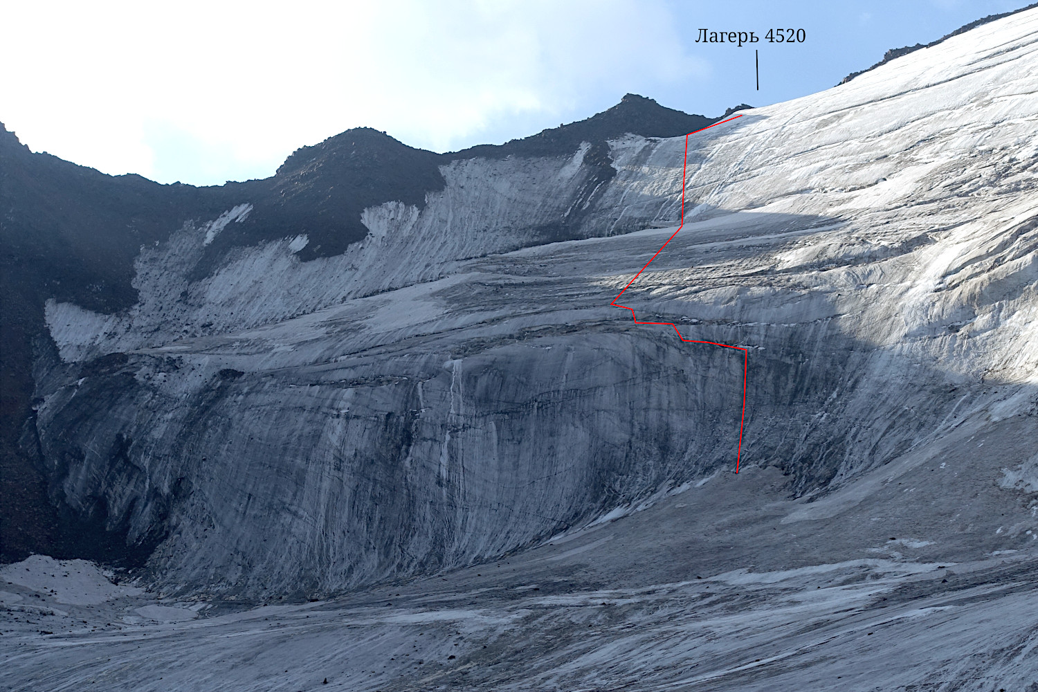 Утром 08.08.2025 мы вышли на ровный ледник и подошли по нему к основанию первого взлёта. В правой (по-ходу) его части имелся снежник, по которому можно было подняться максимально высоко, тем самым, сократив техническую работу на льду. Отсюда мы провесили две веревки перил вверх по линии падения воды, а затем две веревки, которые траверсом поднимались по сети трещин (с удобными полочками на нижних краях) к большой наклонной полке между первым и вторым взлётами, см. фото 21-23. На этой наклонной полке лежало много камней, но они не были опасными, так как полка была сплошь рассечена глубокими и весьма широкими трещинами, см. фото 24. |