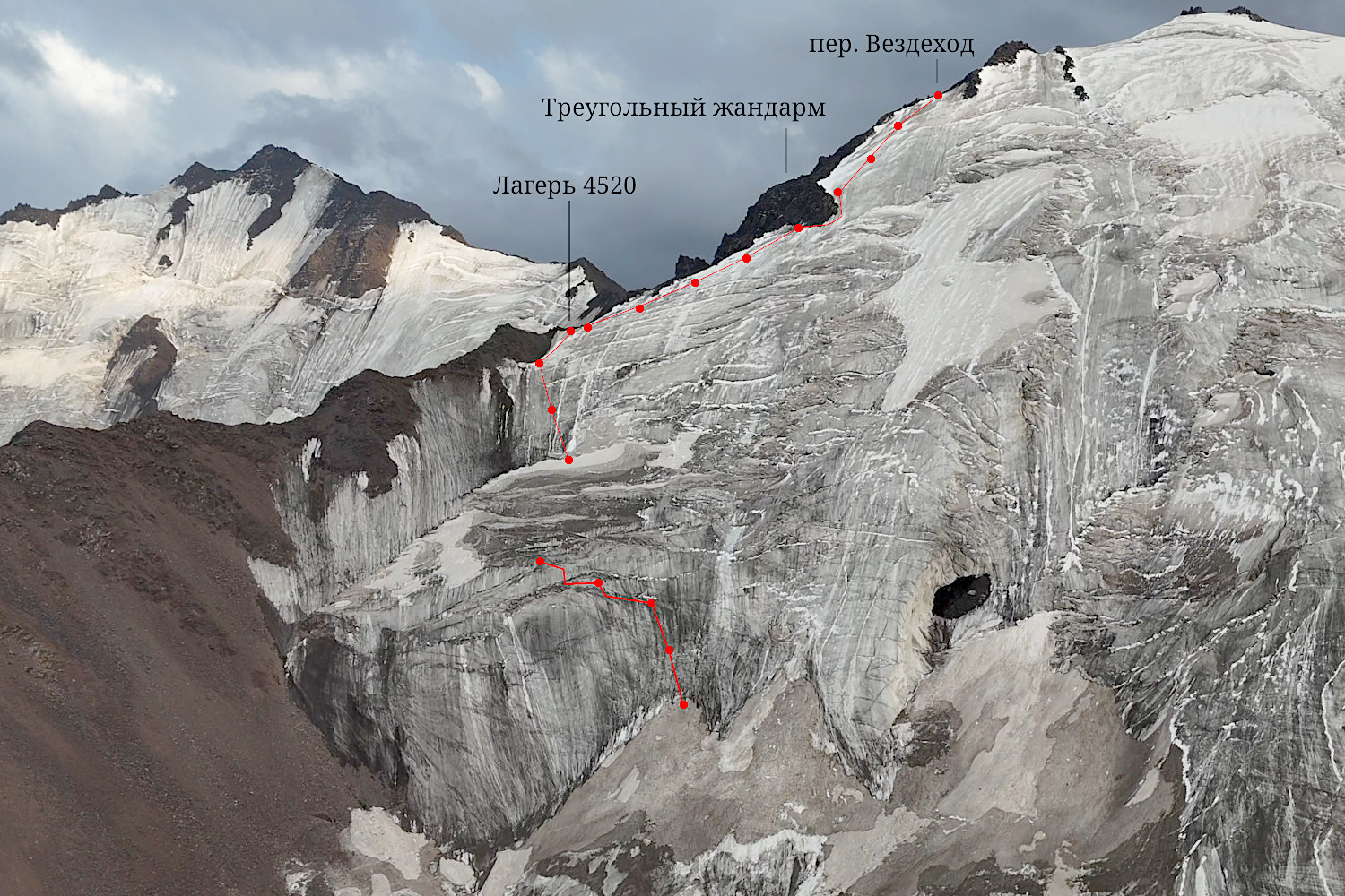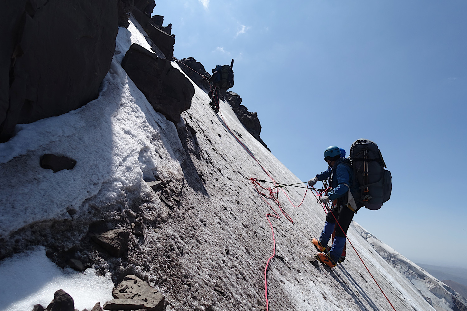 Утром 09.08.2025 мы провесили 4 веревки по льду до треугольного жандарма, см. фото 21 и 27 (такое название этому жандарму дали первопроходцы перевала [4]). Пятая веревка в обход треугольного жандарма проходила по 20-метровому участку очень крутого льда, порядка 55-60 градусов, см. фото 28. Шестая и седьмая веревки были провешены по более пологому льду, а восьмая веревка «проскочила» мимо перевала, лишь первые 15 метров её были действительно необходимы. Но лидер пропустил перевал, потому что тур на скалах слева был совсем не заметен. В результате лидеру и еще троим участникам пришлось возвращаться обратно. |