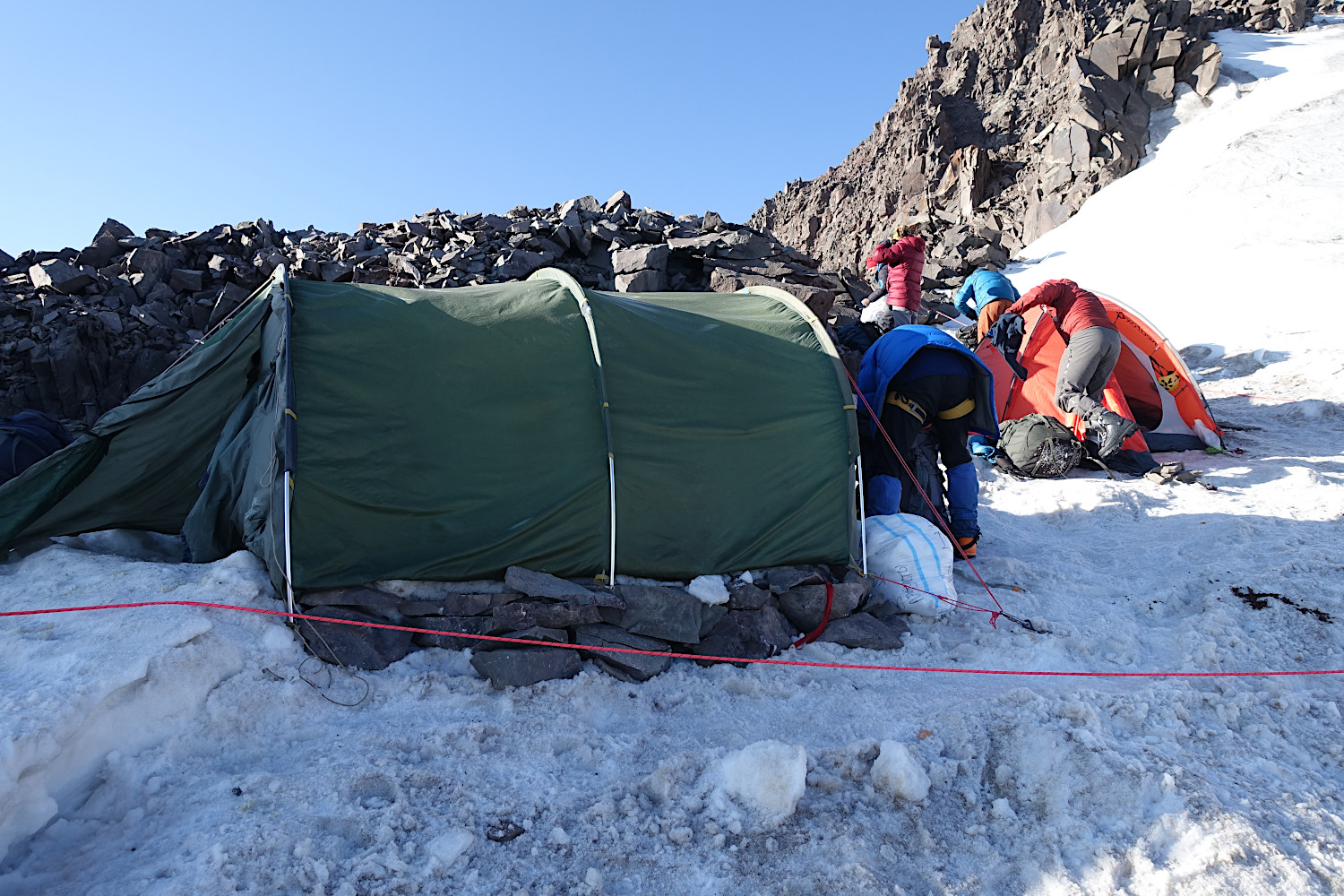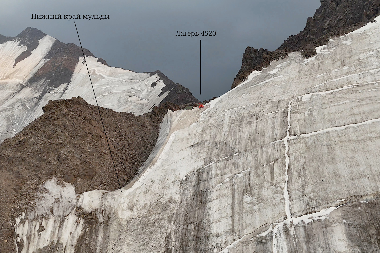По наклонной полке мы шли в связках одновременно, лишь иногда используя ледобурную страховку при форсировании трещин. Ко второму взлёту мы подошли так, чтобы провеска и прохождение перпил были под мульдой, см. фото 21 и 23. Действительно, мульда собирала камни и под нею было безопасно. К счастью, рядом оказался полуразрушенный, но смерзшийся мост через бергшрунд. Выше бергшрунда мы провесили две веревки перил до точки 39° 32.808'N 73° 44.236'E 4495 H на нижнем краю мульды, см. фото 25, и еще одну веревку вдоль края мульды до гребня. Там в точке 39° 32.785'N 73° 44.231'E 4520 H нашлось место для лагеря, см. фото 26. |