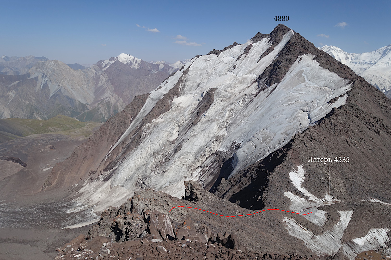 Спуск с пер. Вездеход на ледник № 78-1 проходит по средней осыпи южного склона юго-восточного гребня вершины 4813, см. фото 30. Сначала мы шли вдоль гребня до седла между вершинами 4813 и 4880, а потом с седла спустились на ледник. Там, на моренной гряде в точке 39° 32.556'N 73° 44.280'E 4535 H мы встали лагерем на ночлег. |