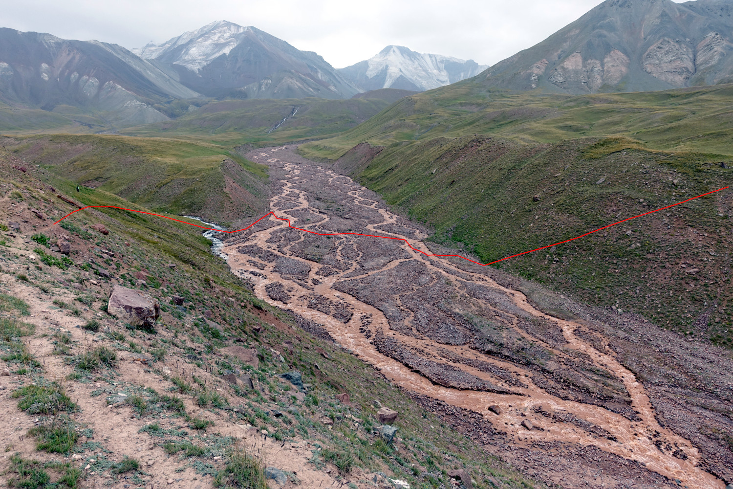 по малой воде. В районе лагеря 3400 река разливается на множество рукавов.